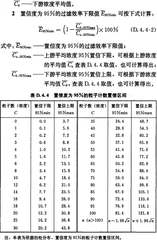 1 首先應(yīng)測(cè)試過濾器上游氣溶膠濃度Cu,并應(yīng)根據(jù)表D.4.4計(jì)算上游95%置信下限的粒子濃度Cu,95%min。