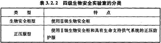 3.2.2 四級生物安全實驗室根據(jù)使用生物安全柜的類型和穿著防護服的不同,可分為生物安全柜型和正壓服型兩類,并可符合表3.2.2的規(guī)定。