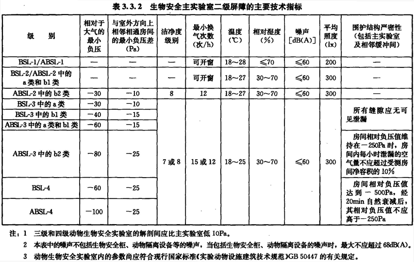3.3.3 三級和四級生物安全實驗室其他房間的主要技術指標應符合表3.3.3的規(guī)定。